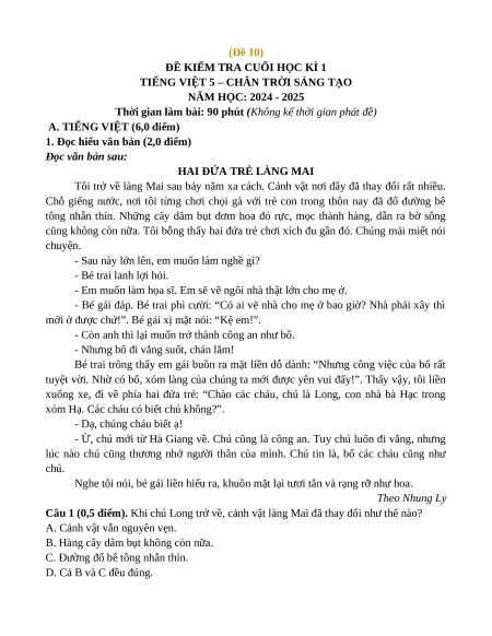 Đề thi cuối kì 1 Tiếng Việt lớp 5 Chân trời sáng tạo (Đề 10)