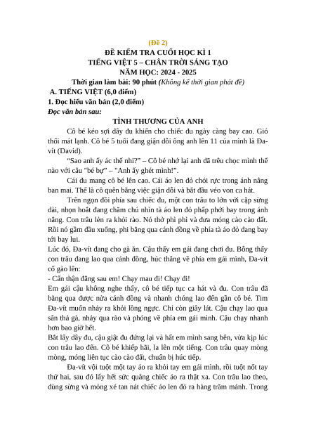 Đề thi cuối kì 1 Tiếng Việt lớp 5 Chân trời sáng tạo (Đề 2)