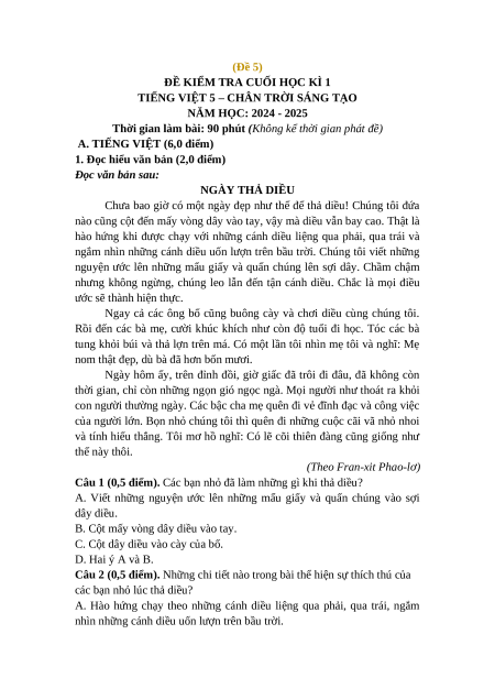 TIẾNG VIỆT 5 – CHÂN TRỜI SÁNG TẠO NĂM HỌC: 2024 - 2025