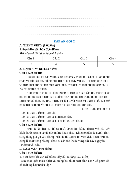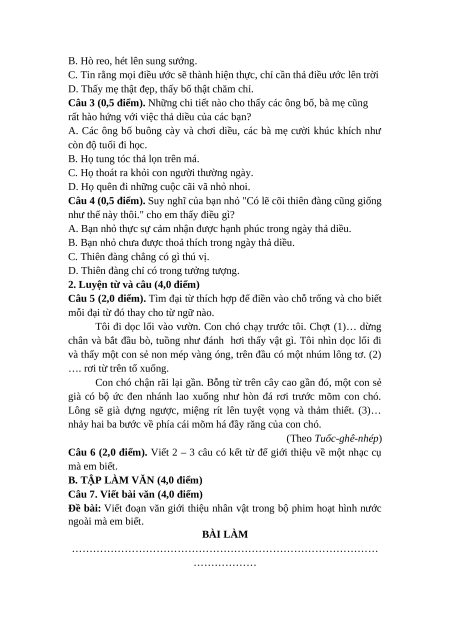 2. Luyện từ và câu (4,0 điểm) Câu 5 (2,0 điểm):