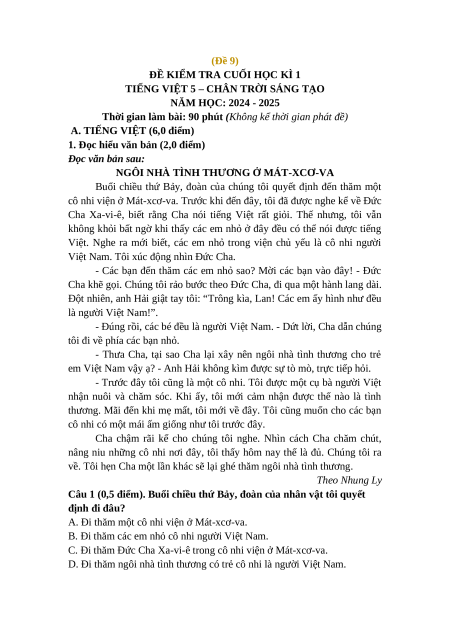 Đề thi cuối kì 1 Tiếng Việt lớp 5 Chân trời sáng tạo (Đề 9)