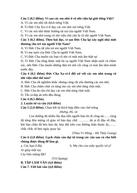 Câu 2 (0,5 điểm). Vì sao các em nhỏ ở cô nhi viện lại giỏi tiếng Việt?