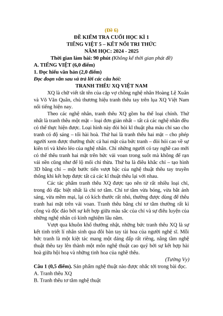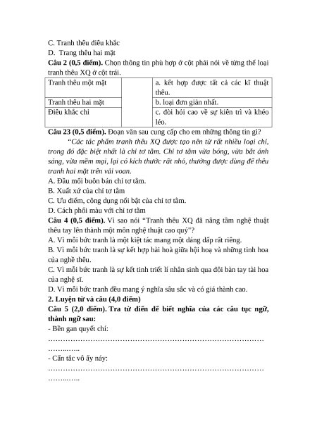 Câu 1 (0,5 điểm). Sản phẩm nghệ thuật nào được nhắc tới trong bài đọc. A. Tranh thêu XQ