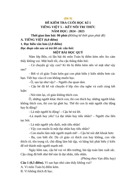 Đề thi cuối kì 1 Tiếng Việt lớp 5 Kết nối tri thức (Đề 9)