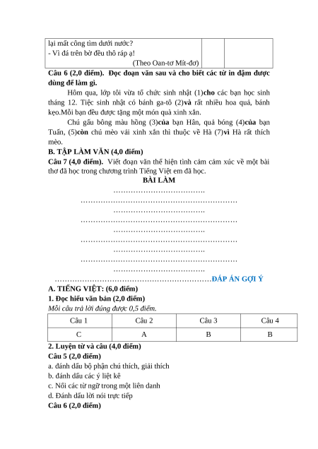 2. Luyện từ và câu (4,0 điểm) Câu 5 (2,0 điểm)