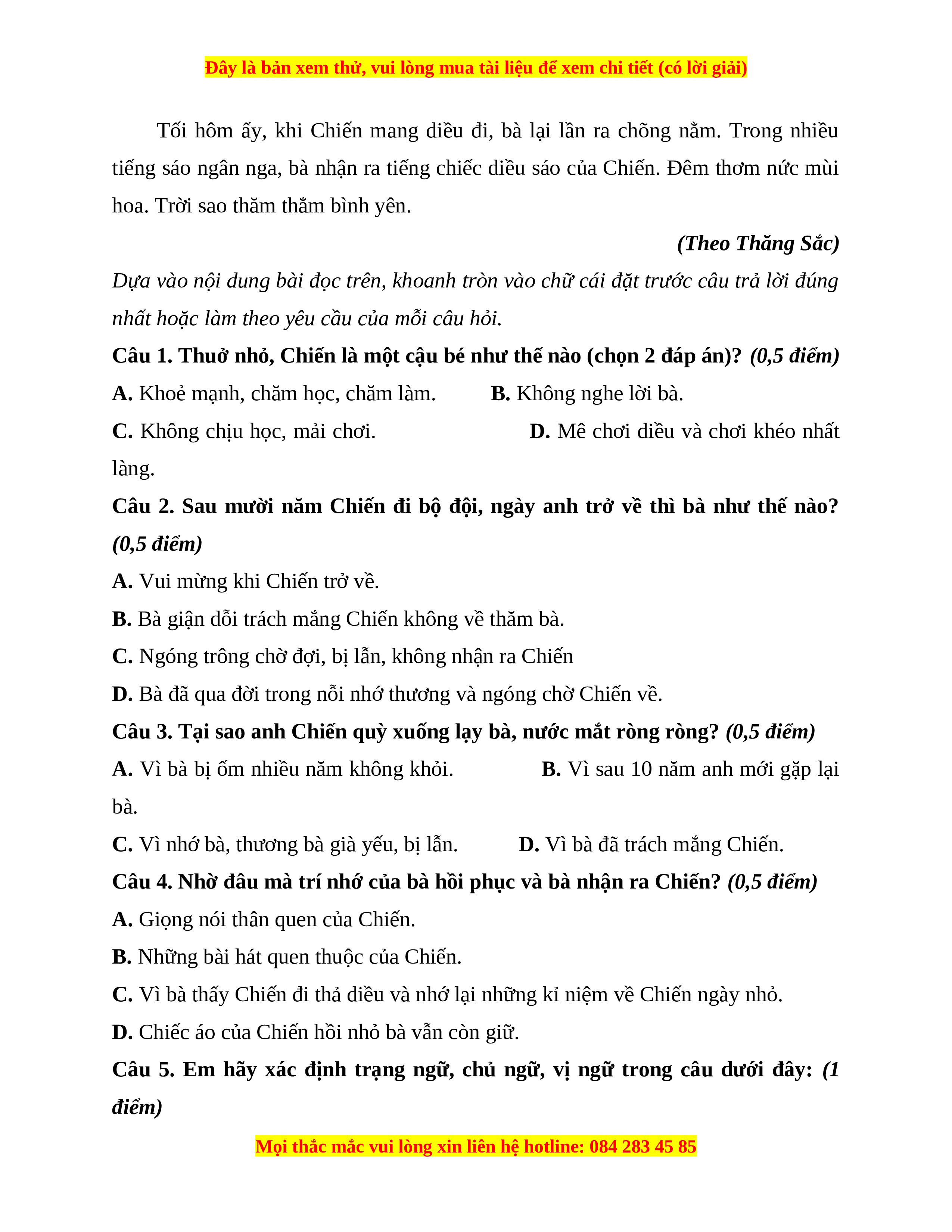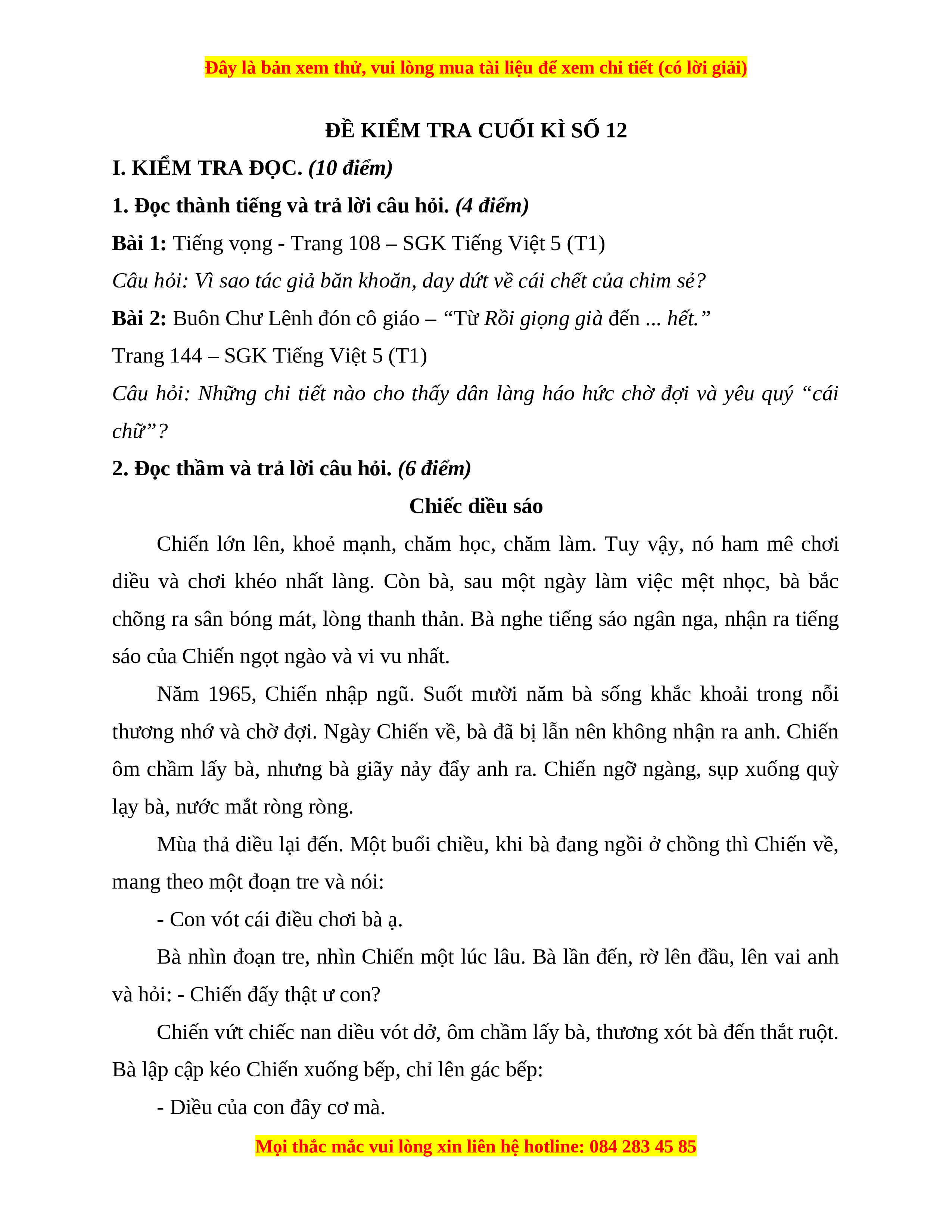 2. Đọc thầm và trả lời câu hỏi. (6 điểm) Chiếc diều sáo