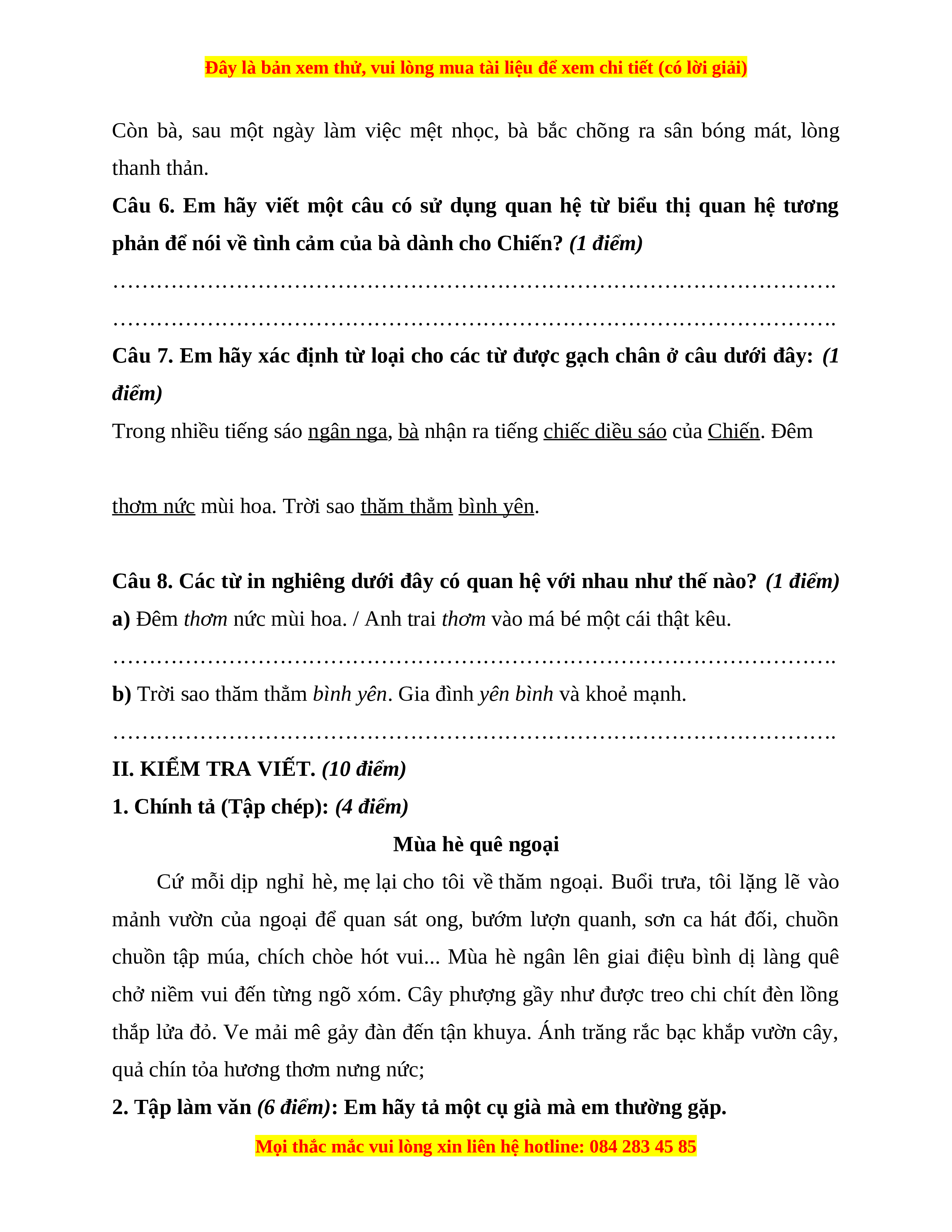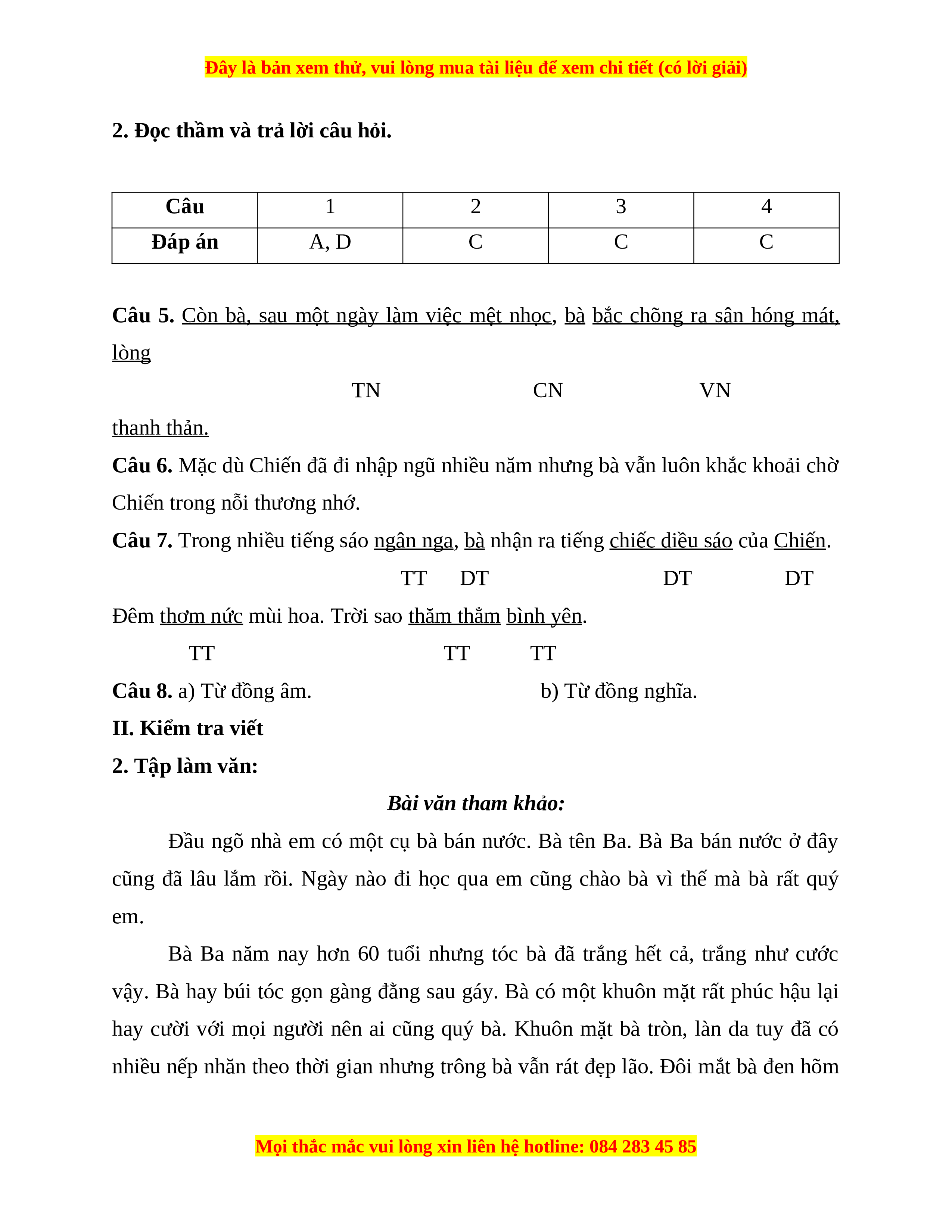 2. Đọc thầm và trả lời câu hỏi. (6 điểm)