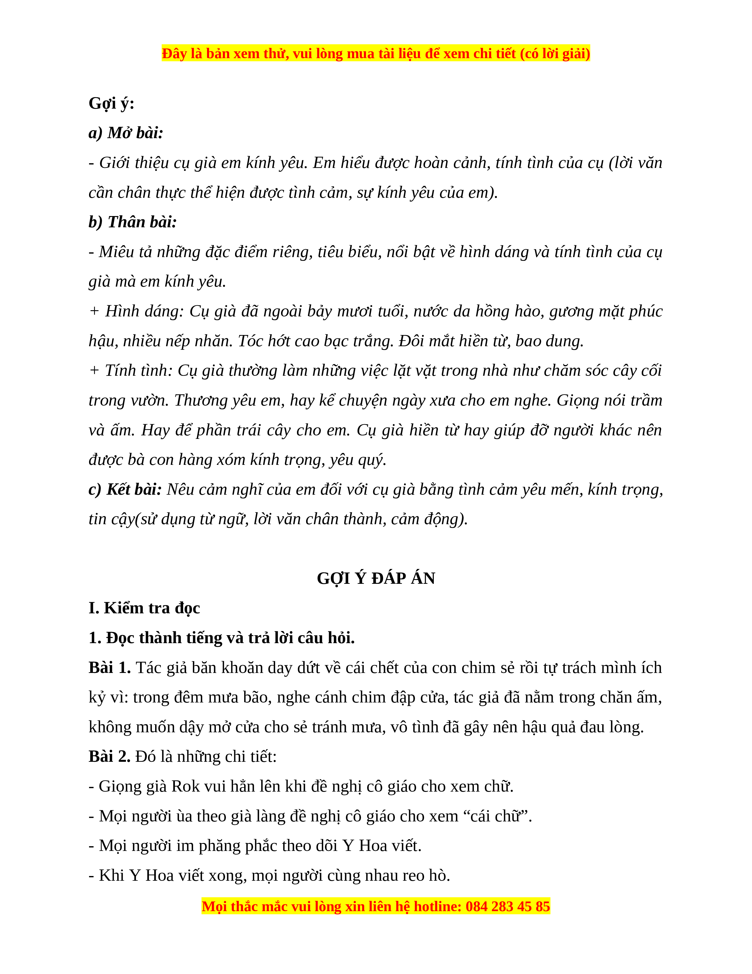tin cậy(sử dụng từ ngữ, lời văn chân thành, cảm động). GỢI Ý ĐÁP ÁN I. Kiểm tra đọc