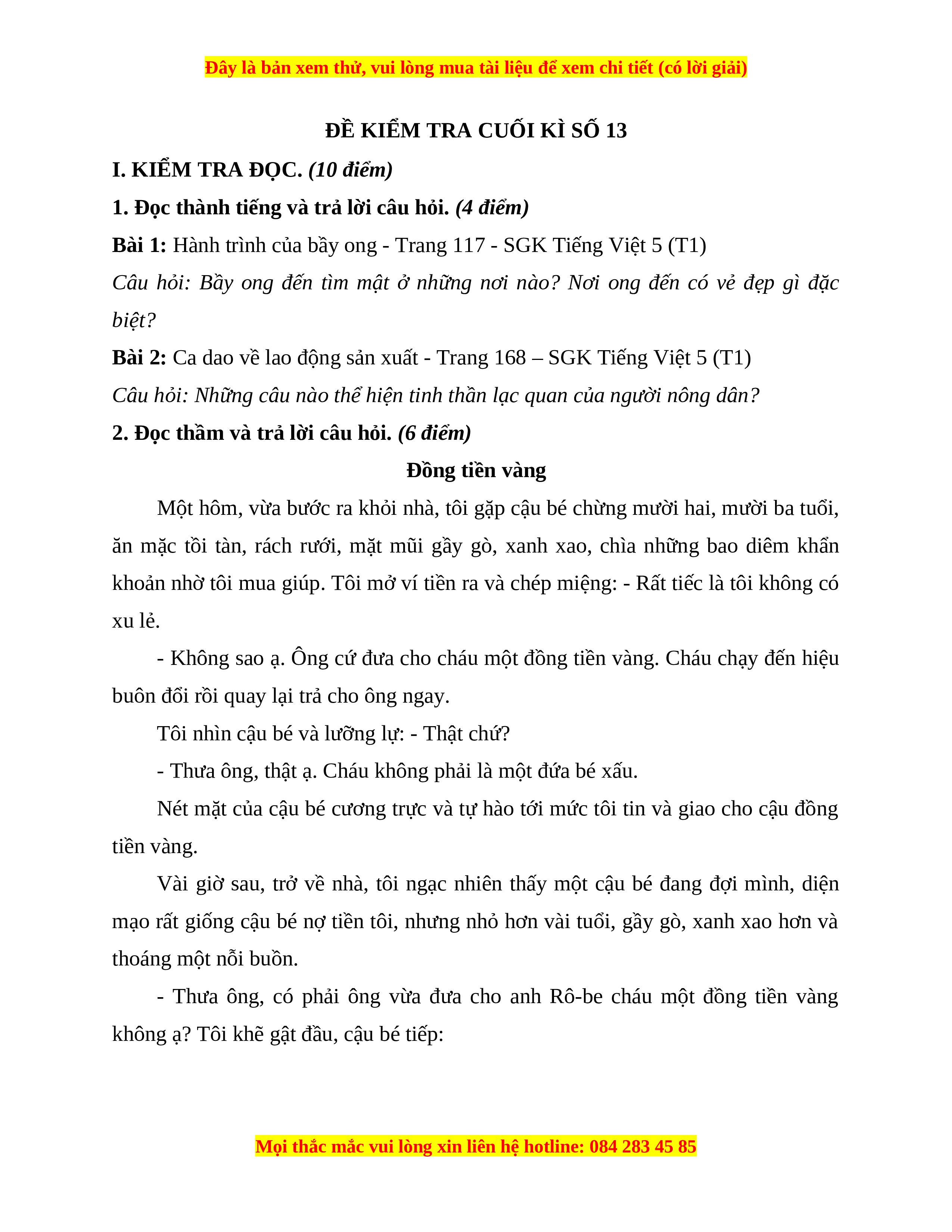 2. Đọc thầm và trả lời câu hỏi. (6 điểm) Đồng tiền vàng