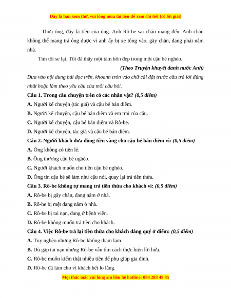 Câu 4. Việc Rô-be trả lại tiền thừa cho khách đáng quý ở điểm: (0,5 điểm)