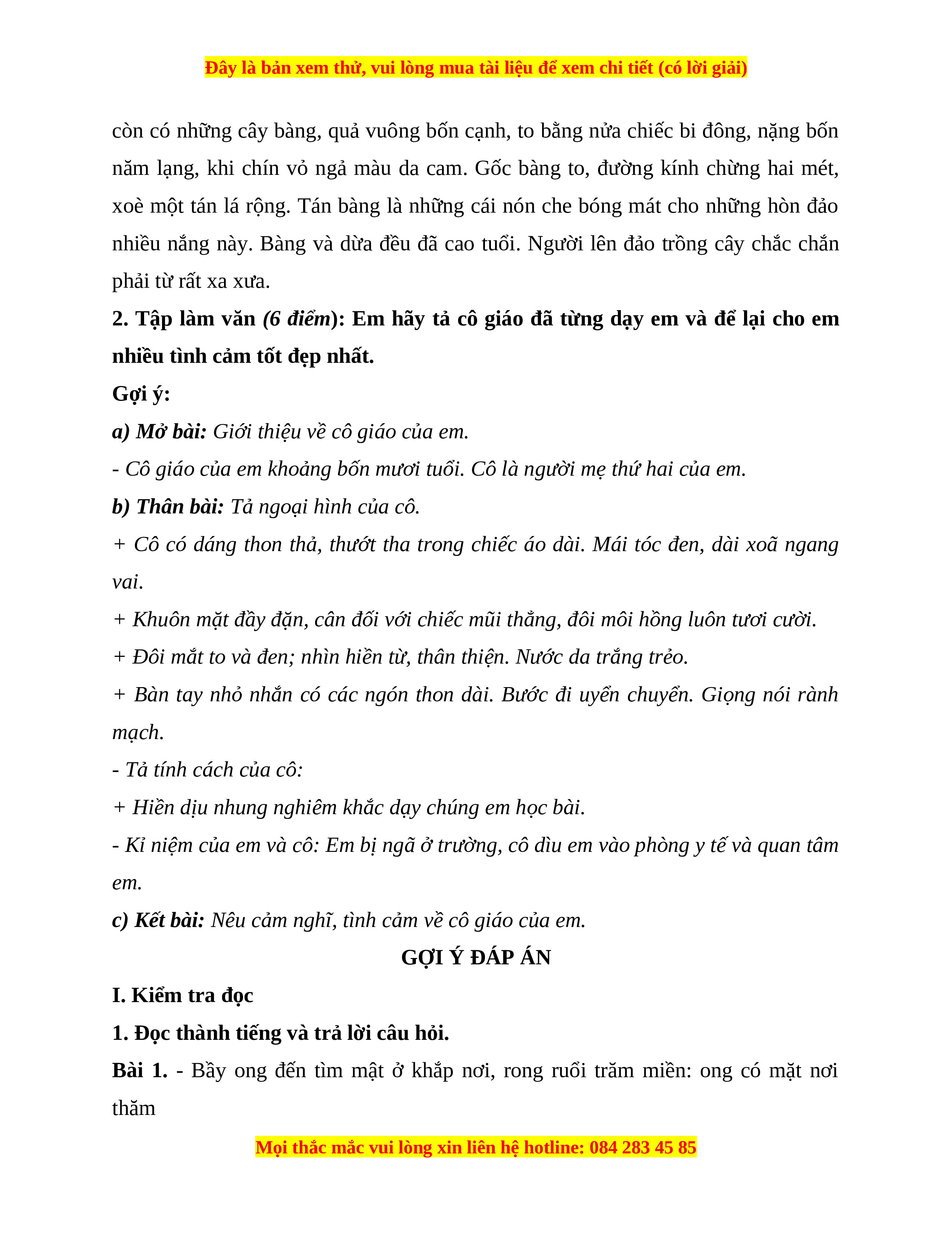 c) Kết bài: Nêu cảm nghĩ, tình cảm về cô giáo của em. GỢI Ý ĐÁP ÁN I. Kiểm tra đọc