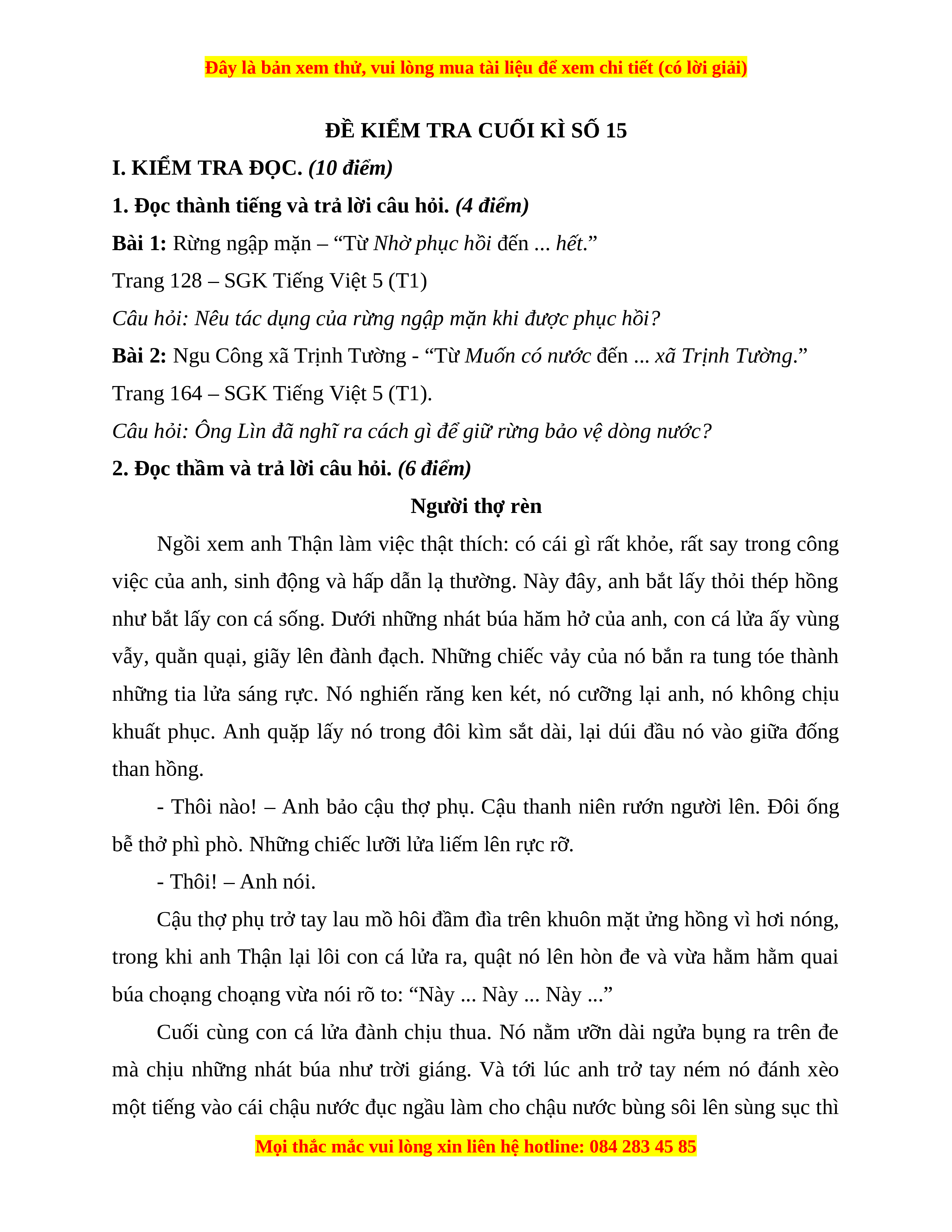 ĐỀ KIỂM TRA CUỐI KÌ SỐ 15