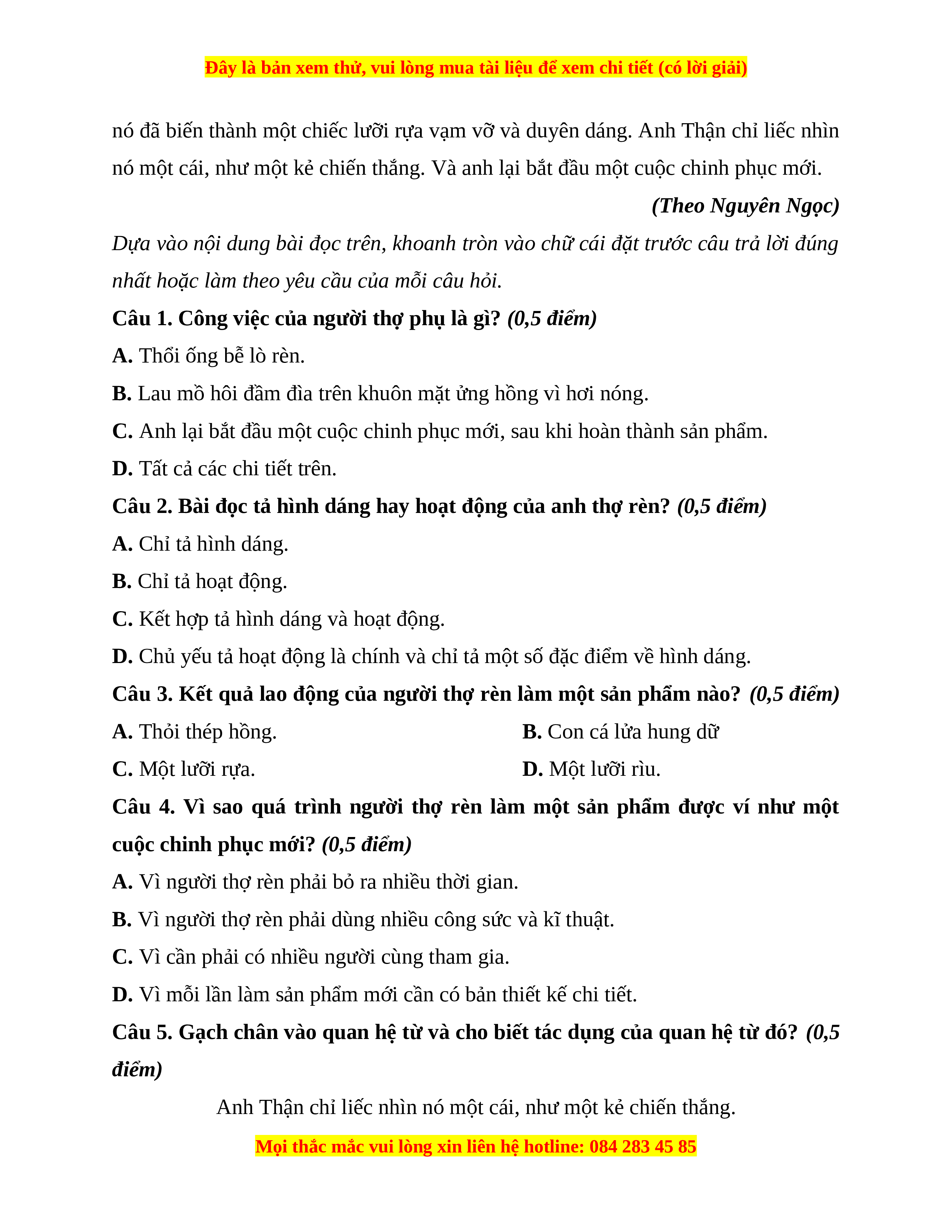 2. Đọc thầm và trả lời câu hỏi. (6 điểm) Người thợ rèn