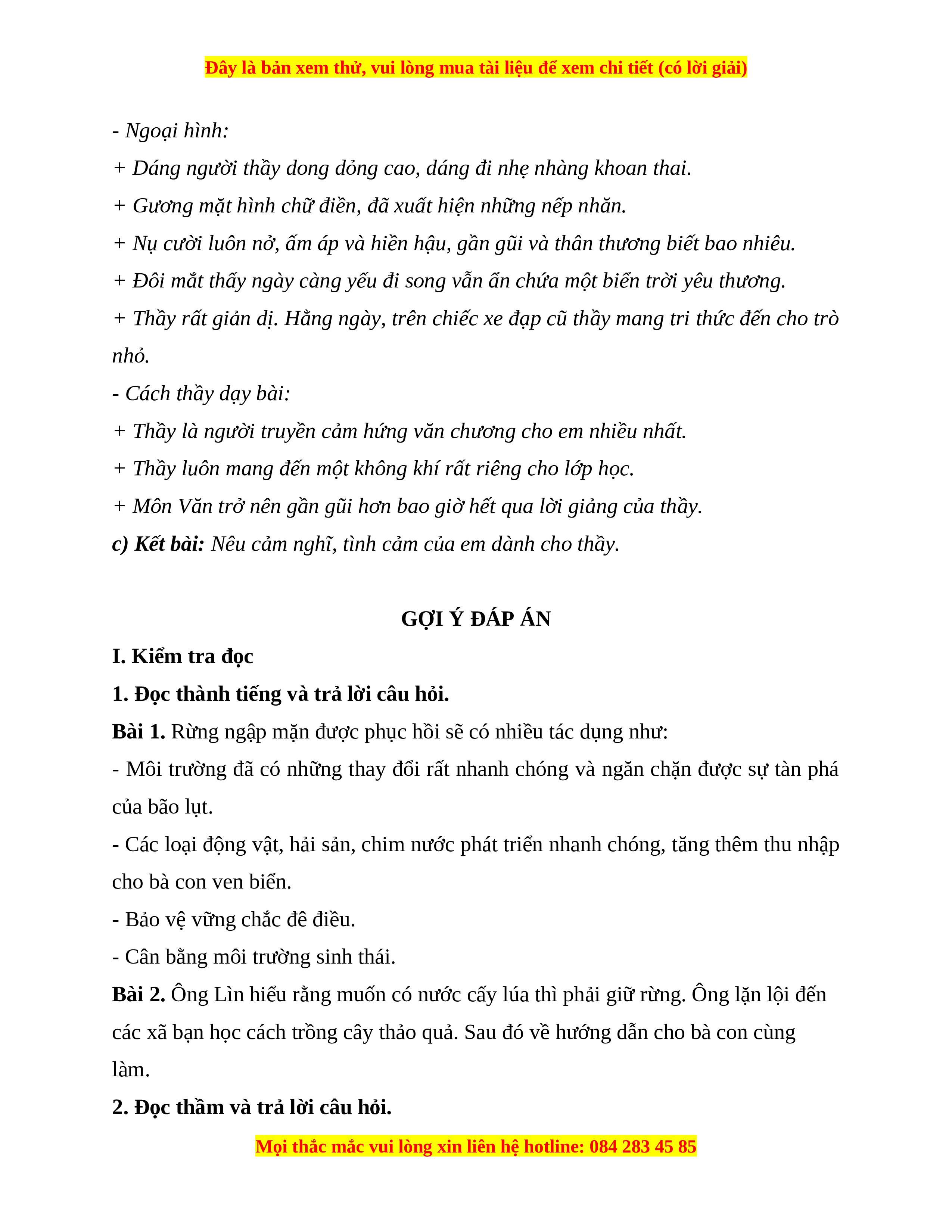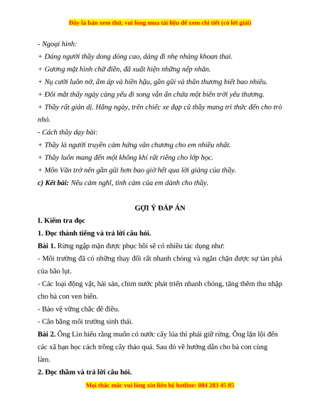 c) Kết bài: Nêu cảm nghĩ, tình cảm của em dành cho thầy. GỢI Ý ĐÁP ÁN I. Kiểm tra đọc