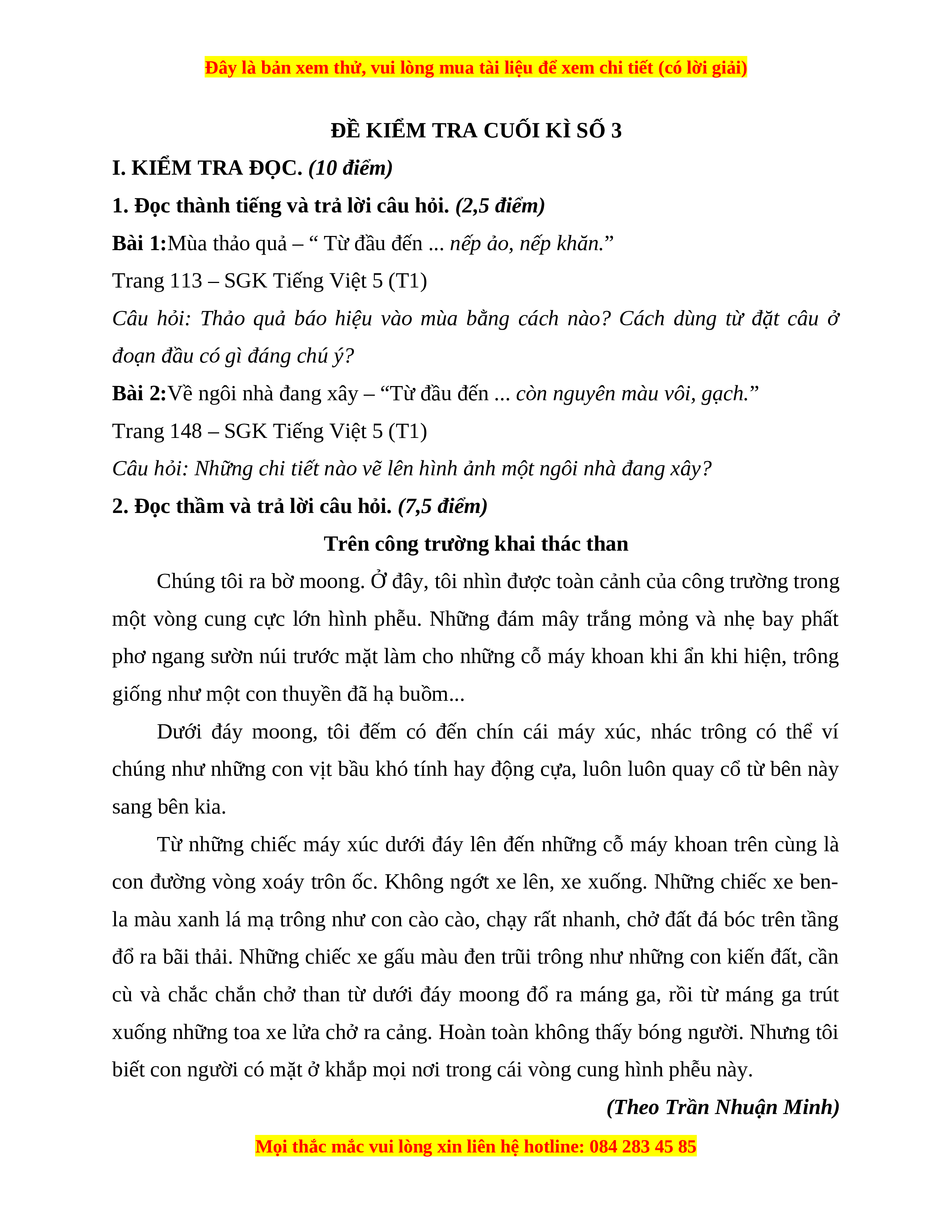 1. Đọc thành tiếng và trả lời câu hỏi. (2,5 điểm)