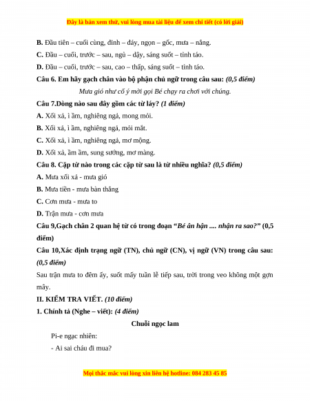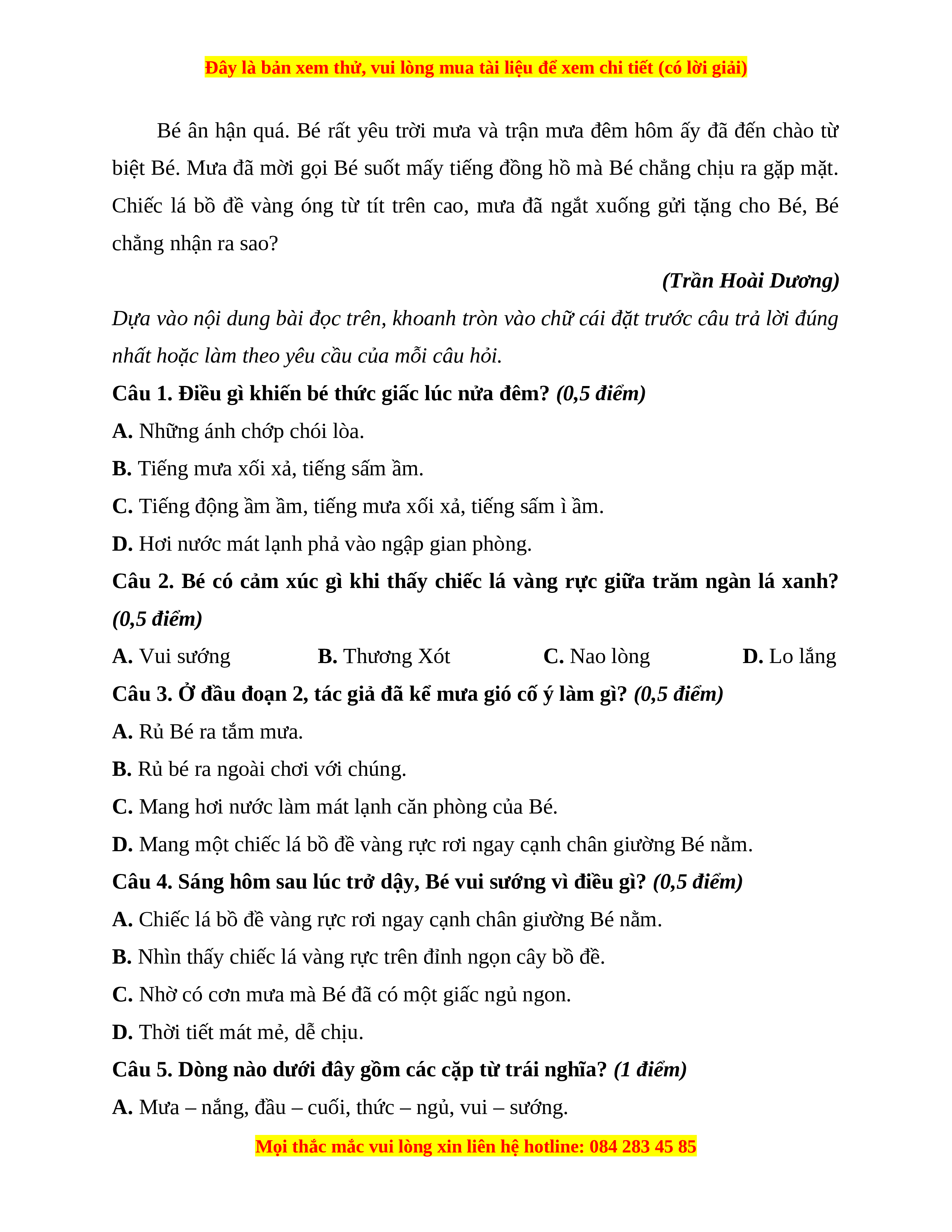 2. Đọc thầm và trả lời câu hỏi. (6 điểm) Mưa cuối mùa