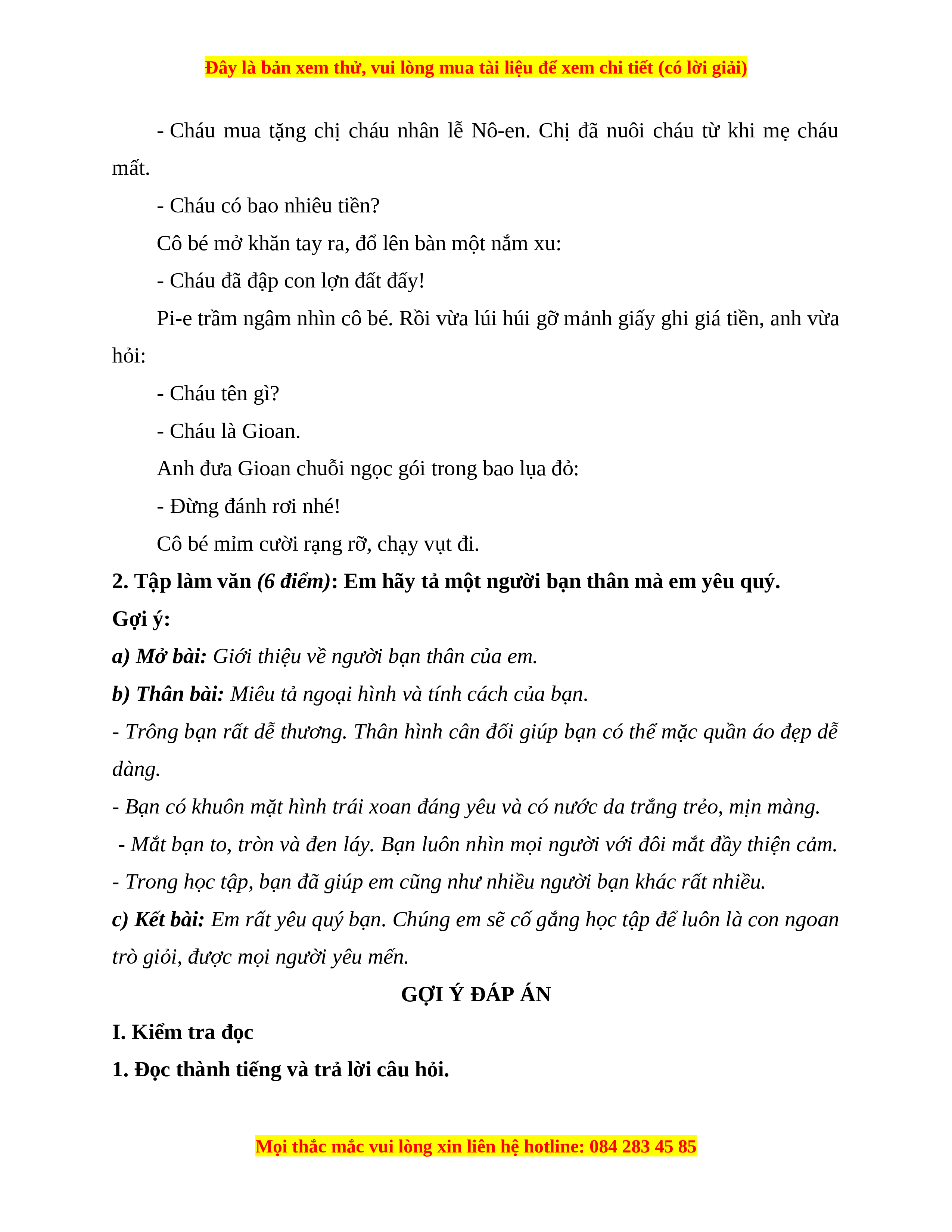 I. KIỂM TRA ĐỌC. (10 điểm)