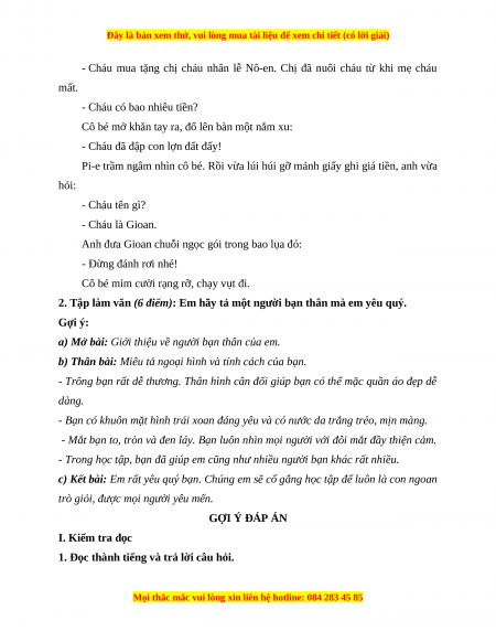 2. Tập làm văn (6 điểm): Em hãy tả một người bạn thân mà em yêu quý. Gợi ý: