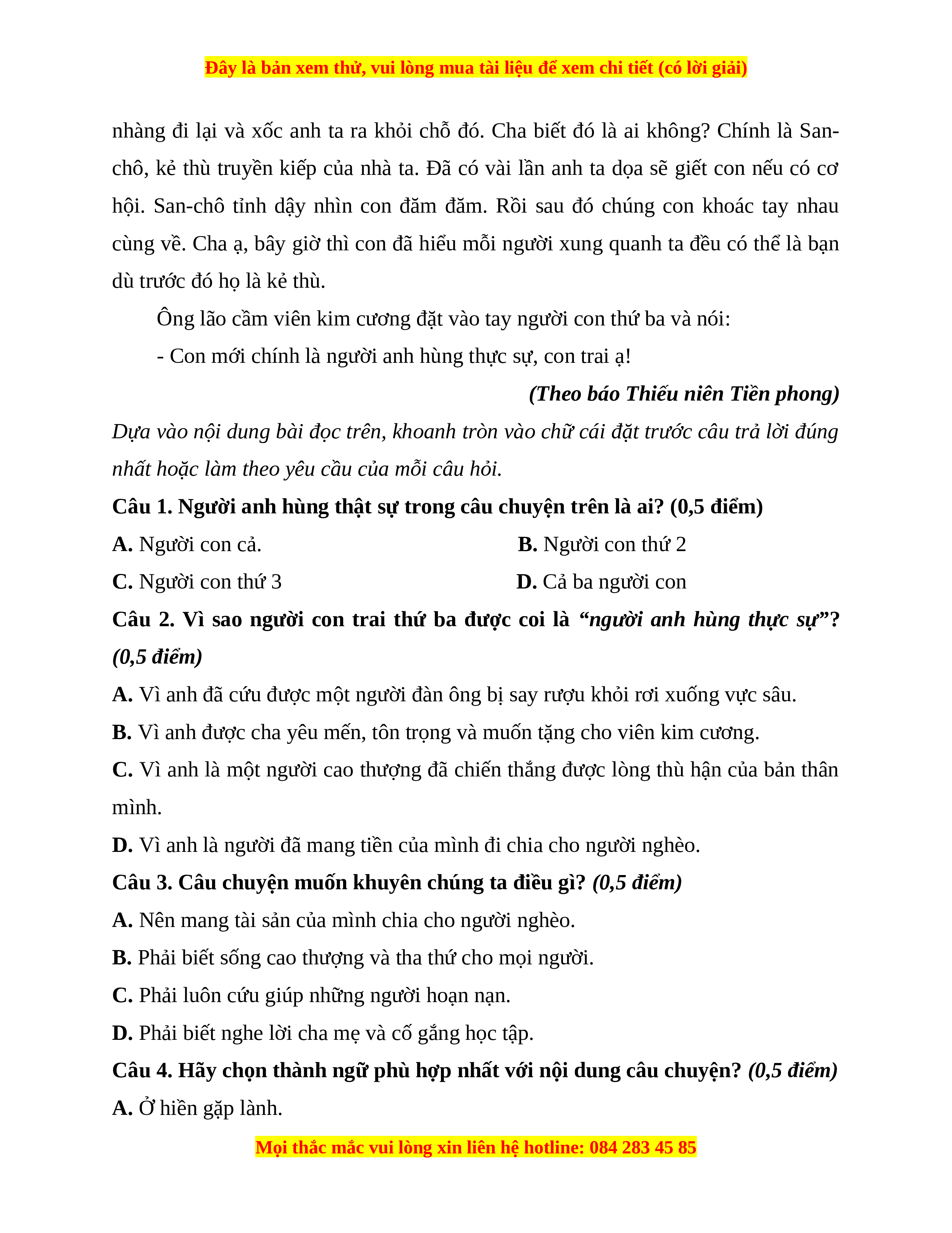 Câu 1. Người anh hùng thật sự trong câu chuyện trên là ai? (0,5 điểm)