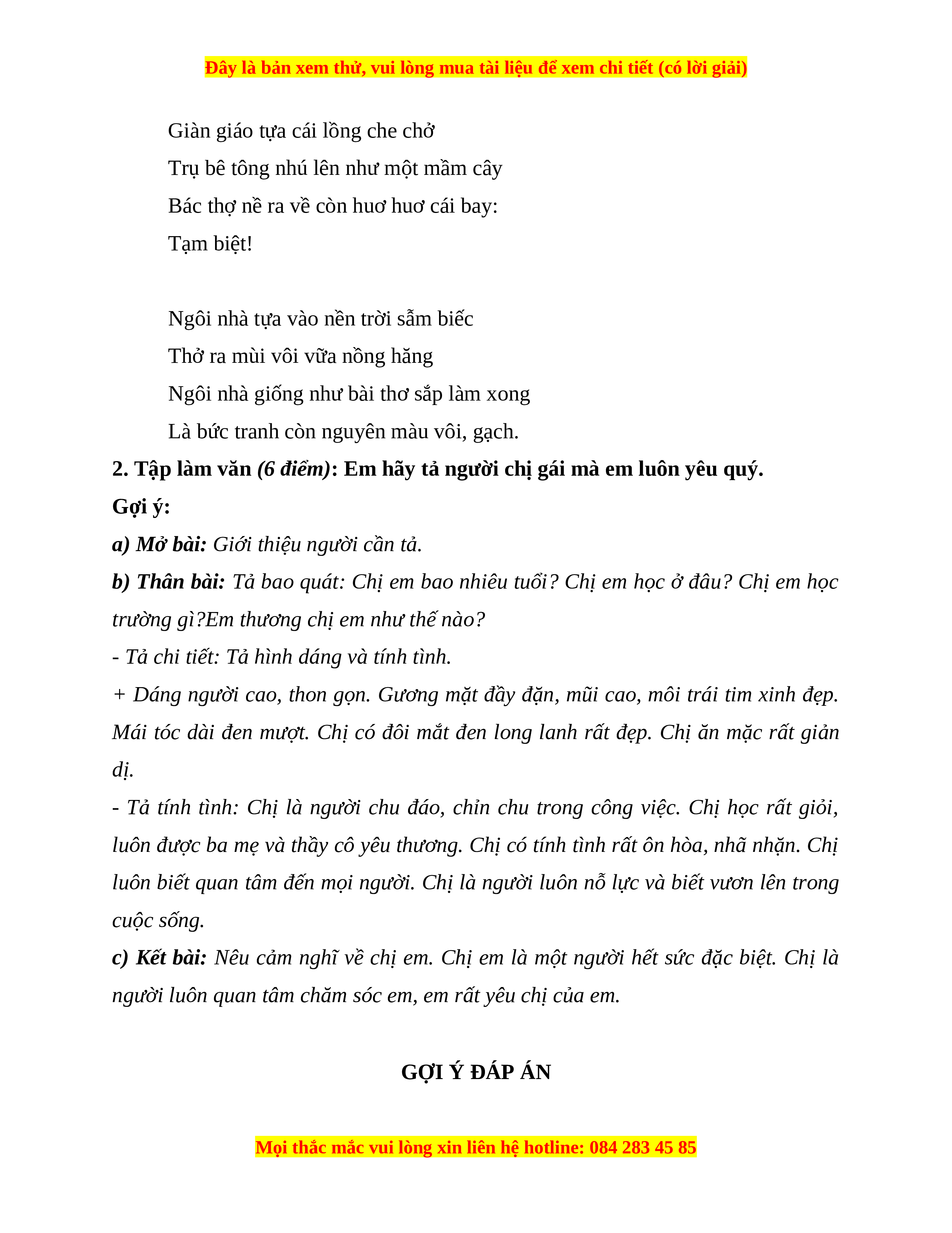 2. Tập làm văn (6 điểm): Em hãy tả người chị gái mà em luôn yêu quý. Gợi ý: