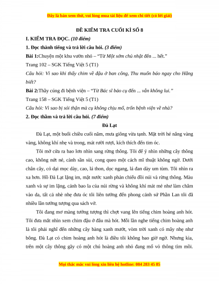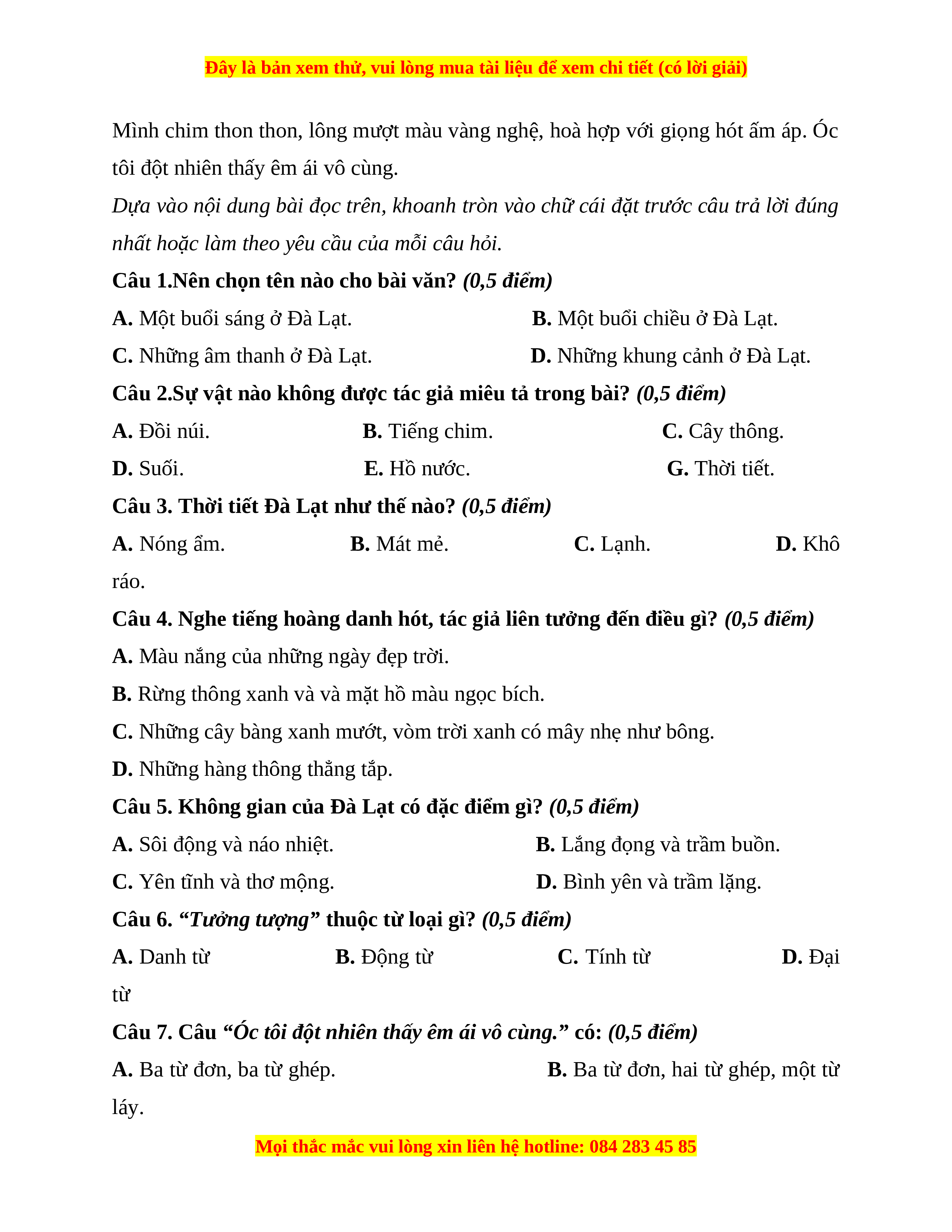 2. Đọc thầm và trả lời câu hỏi. (7 điểm) Đà Lạt