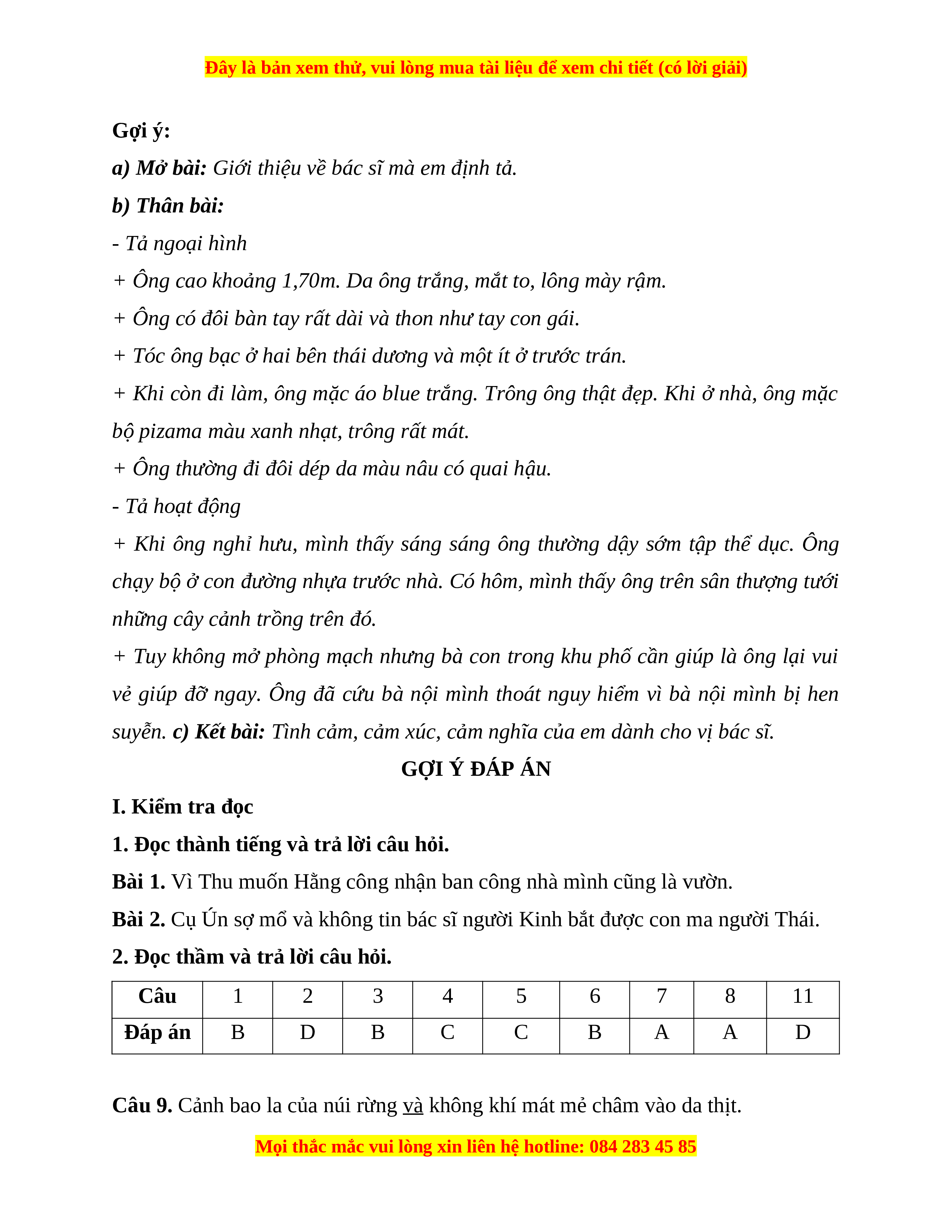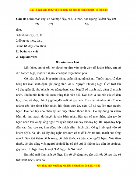 suyễn. c) Kết bài: Tình cảm, cảm xúc, cảm nghĩa của em dành cho vị bác sĩ. GỢI Ý ĐÁP ÁN I. Kiểm tra đọc