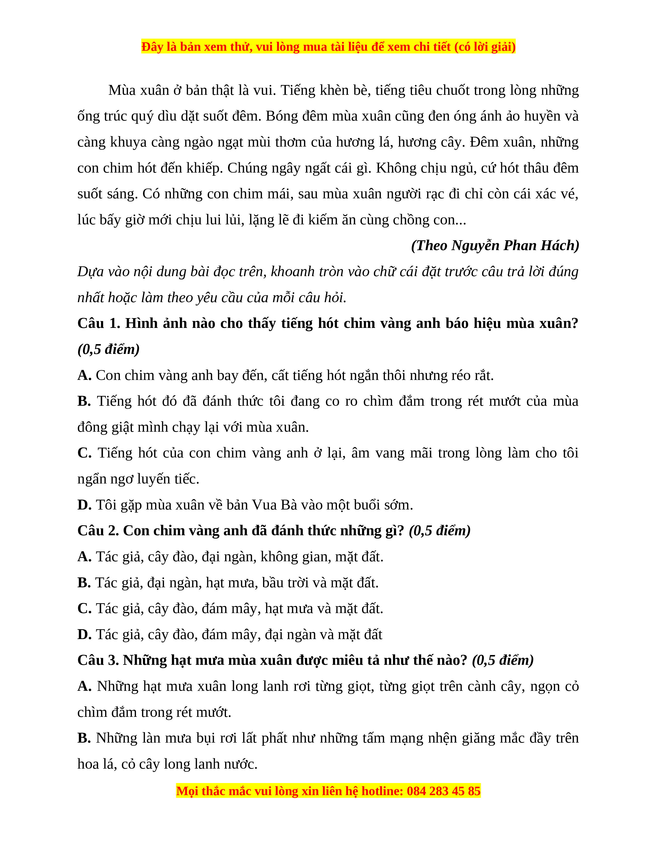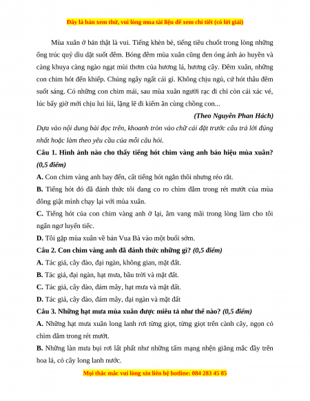 Câu 1. Hình ảnh nào cho thấy tiếng hót chim vàng anh báo hiệu mùa xuân? (0,5 điểm)