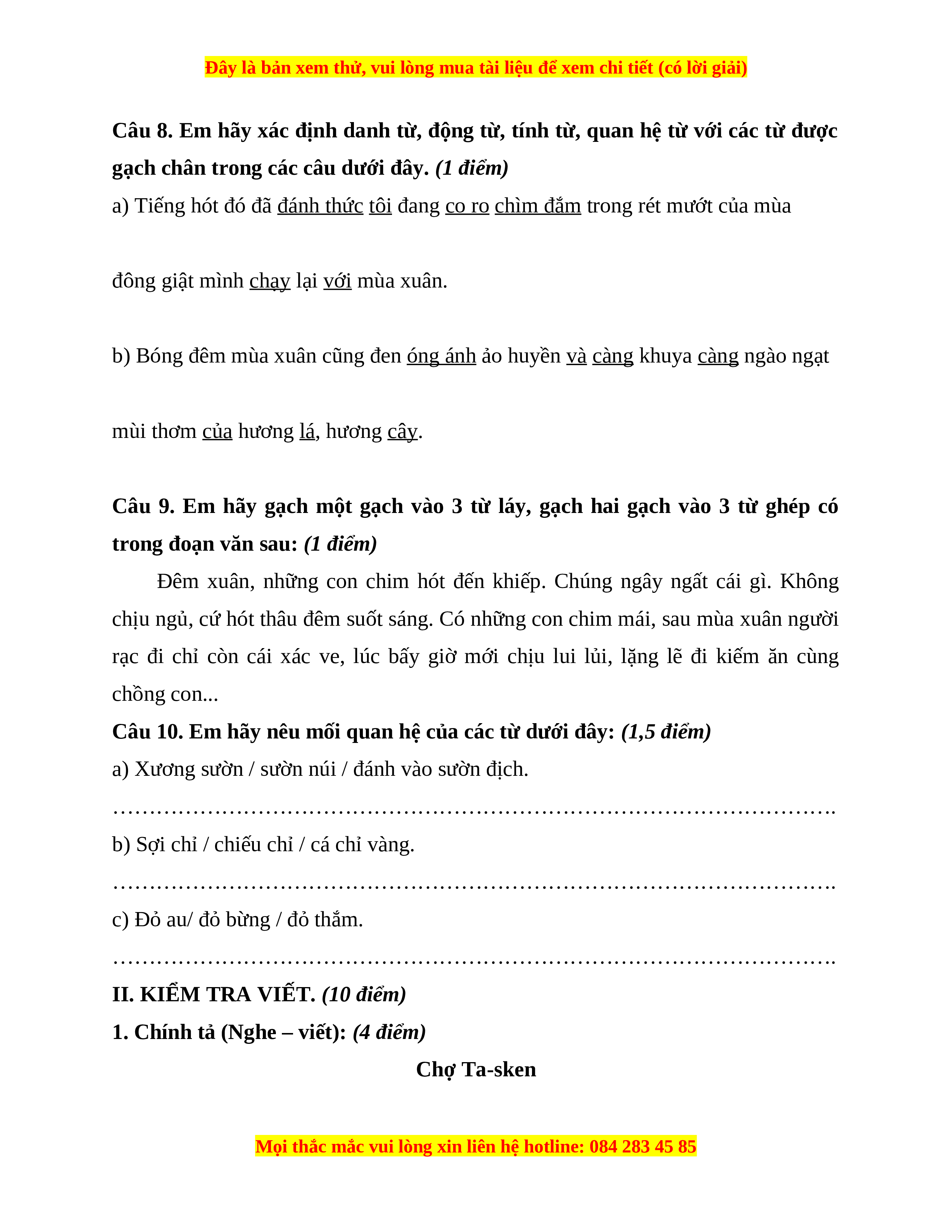 1. Chính tả (Nghe – viết): (4 điểm) Chợ Ta-sken