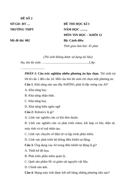 MÔN TIN HỌC – KHỐI 12 Mã đề thi: 002 Bộ: Cánh diều