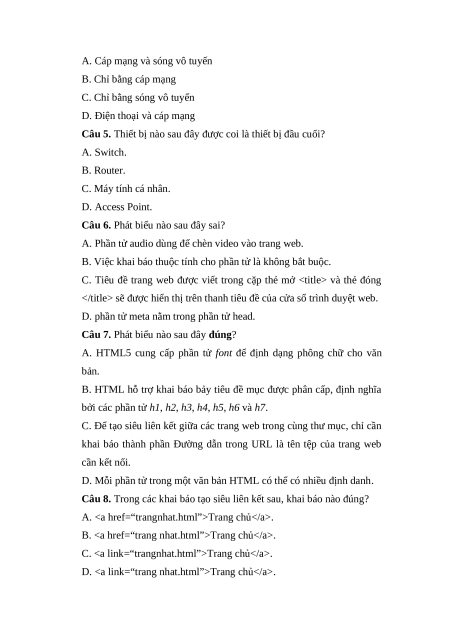 Câu 8. Trong các khai báo tạo siêu liên kết sau, khai báo nào đúng? A. Trang chủ. B. Trang chủ. C. Trang chủ. D. Trang chủ.