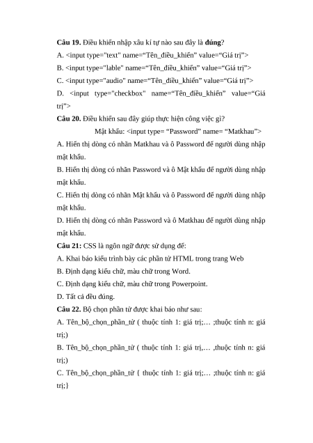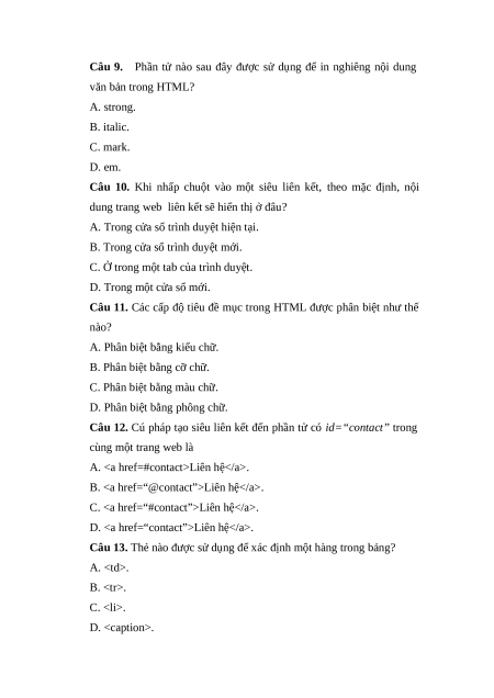 Câu 9. Phần tử nào sau đây được sử dụng để in nghiêng nội dung văn bản trong HTML? A. strong. B. italic. C. mark. D. em.