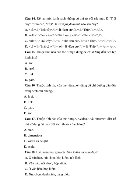 Câu 16. Thuộc tính nào của thẻ dùng để chỉ đường dẫn đến trang web cần nhúng? A. href. B. link. C. path. D. src.