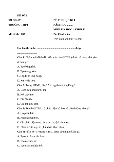 MÔN TIN HỌC – KHỐI 12 Mã đề thi: 003 Bộ: Cánh diều