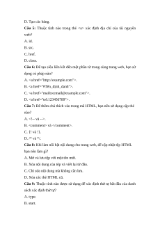 Câu 5: Thuộc tính nào trong thẻ xác định địa chỉ của tài nguyên web? A. id. B. src. C. href. D. class.