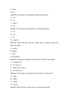 Câu 12: Thuộc tính nào trong thẻ Câu 13: Cú pháp nào là đúng để khai báo một ô dữ liệu trong bảng? A. Data. B. Data. C. . D. Data.