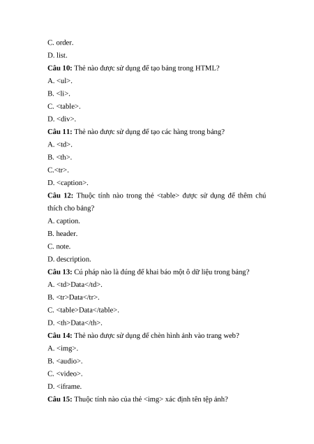 Câu 10: Thẻ nào được sử dụng để tạo bảng trong HTML? A.