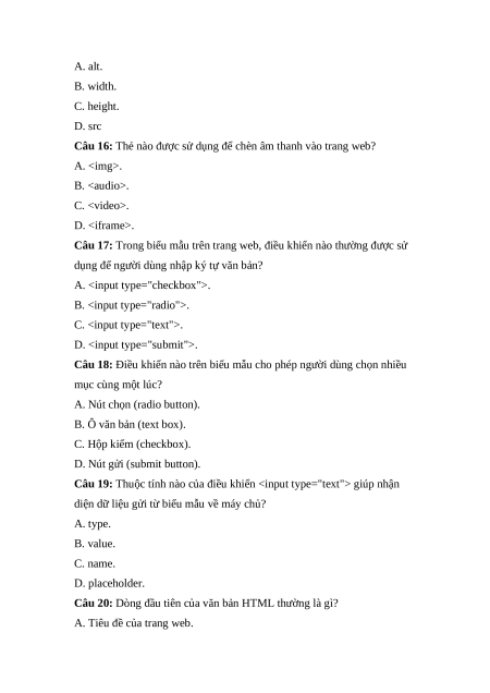 Câu 16: Thẻ nào được sử dụng để chèn âm thanh vào trang web? A. . B. . C. . D. .