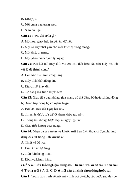 Câu 1: Ngôn ngữ đánh dấu siêu văn bản (HTML) được sử dụng chủ yếu để làm gì? A. Tạo bảng tính. B. Tạo trang web. C. Lập trình ứng dụng. D. Xử lý dữ liệu.