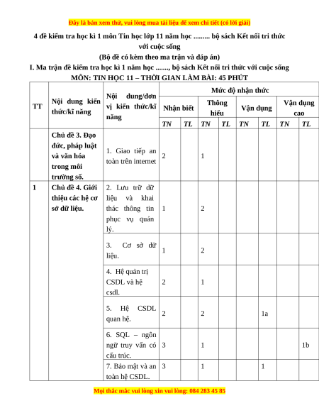 I. Ma trận đề kiểm tra học kì 1 năm học ......., bộ sách Kết nối tri thức với cuộc sống