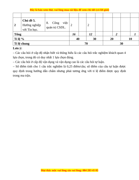 Chủ đề 5. 8. Công việc 2 Hướng nghiệp 2 2 quản trị CSDL. với Tin học. Tổng 16 12 2 1 Tỉ lệ % 40 30 20 10 Tỉ lệ chung 70 30 Lưu ý:
