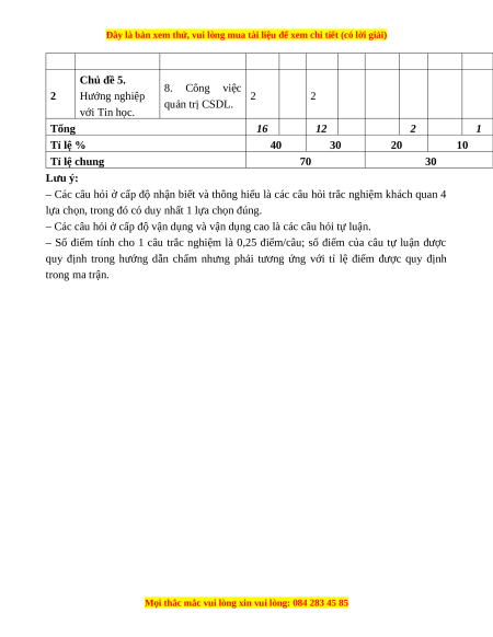 Chủ đề 5. 8. Công việc 2 Hướng nghiệp 2 2 quản trị CSDL. với Tin học. Tổng 16 12 2 1 Tỉ lệ % 40 30 20 10 Tỉ lệ chung 70 30 Lưu ý: