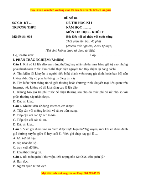 MÔN TIN HỌC – KHỐI 11 Mã đề thi: 004