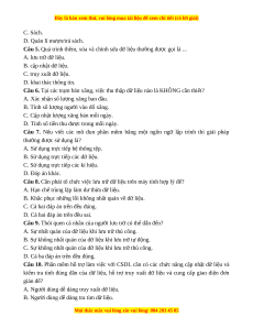 Câu 5. Quá trình thêm, xóa và chỉnh sửa dữ liệu thường được gọi là ... A. lưu trữ dữ liệu. B. cập nhật dữ liệu. C. truy xuất dữ liệu. D. khai thác thông tin.