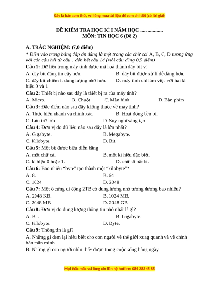 Câu 6: Bao nhiêu “byte” tạo thành một “kilobyte”? A. 8. B. 64 C. 1024 D. 2048