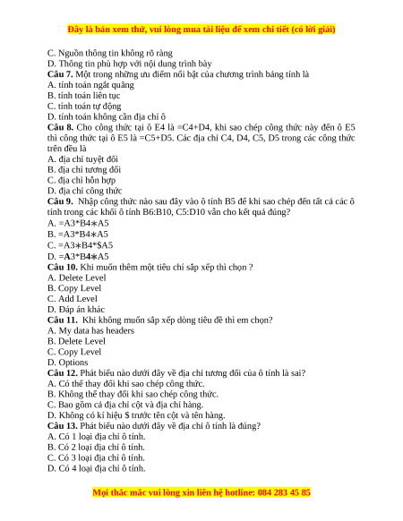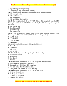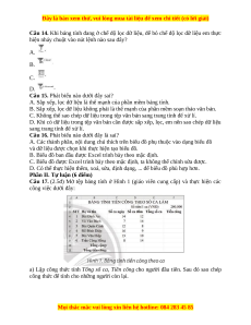 Câu 10. Khi muốn thêm một tiêu chí sắp xếp thì chọn ? A. Delete Level B. Copy Level C. Add Level D. Đáp án khác