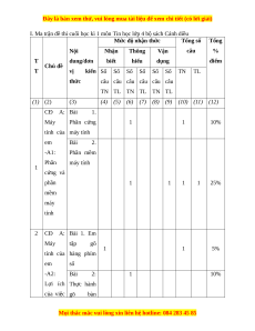 (4) (5) (6) (7) (8) (9) (10) (11) (12) CĐ A: Bài 1. Máy Phần cứng 1 1 10% tính của máy tính em Bài 2. -A1: Phần mềm Phần máy tính 1 cứng và phần 1 1 1 1 25% mềm máy tính 2 CĐ A: Bài 1. Em Máy tập gõ 1 1 5% tính của hàng phím em số -A2: Bài 2: 1 10% Lợi ích Thực hành của việc gõ bàn