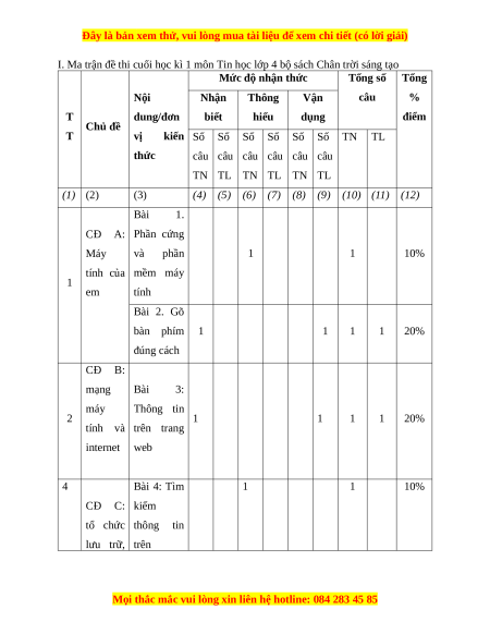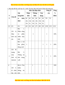 (4) (5) (6) (7) (8) (9) (10) (11) (12) Bài 1. CĐ A: Phần cứng Máy và phần 1 1 10% tính của mềm máy 1 em tính Bài 2. Gõ bàn phím 1 1 1 1 20% đúng cách CĐ B: mạng Bài 3: máy Thông tin 2 1 1 1 1 20% tính và trên trang internet web 4 Bài 4: Tìm 1 1 10% CĐ C: kiếm tổ chức thông tin lưu trữ, trên