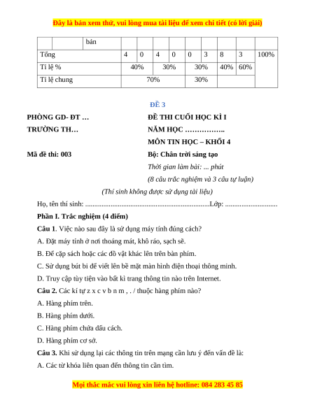 MÔN TIN HỌC – KHỐI 4 Mã đề thi: 003