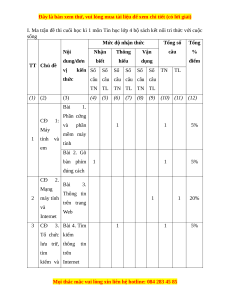 (4) (5) (6) (7) (8) (9) (10) (11) (12) Bài 1. Phần cứng CĐ 1: và phần 1 1 5% Máy mềm máy 1 tính và tính em Bài 2. Gõ bàn phím 1 1 5% đúng cách CĐ 2. Bài 3. Mạng Thông tin 2 máy tính 1 1 20% trên trang và Web Internet 3 CĐ 3. Bài 4. Tìm 1 1 5% Tổ chức kiếm lưu trữ, thông tin tìm trên kiếm và Internet