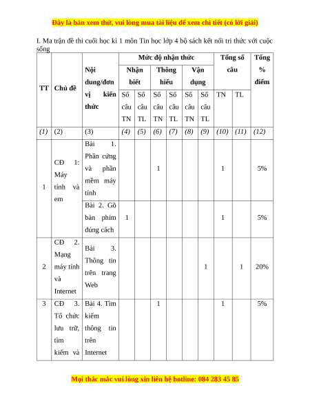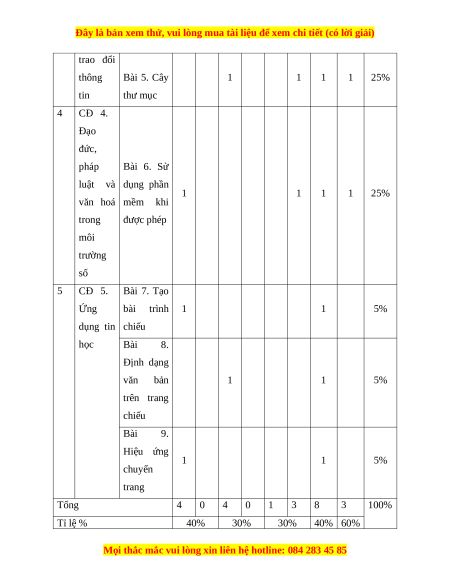 trao đổi thông Bài 5. Cây 1 1 1 1 25% tin thư mục 4 CĐ 4. Đạo đức, pháp Bài 6. Sử luật và dụng phần 1 1 1 1 25% văn hoá mềm khi trong được phép môi trường số 5 CĐ 5. Bài 7. Tạo Ứng bài trình 1 1 5% dụng tin chiếu học Bài 8. Định dạng văn bản 1 1 5% trên trang chiếu Bài 9. Hiệu ứng 1 1 5% chuyển trang Tổng 4 0 4 0 1 3 8 3 100% Tỉ lệ % 40% 30% 30% 40% 60%